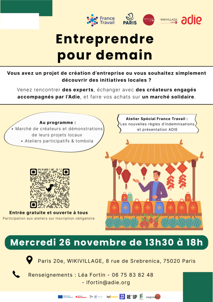 Vous avez un projet de création d’entreprise ou vous souhaitez simplement découvrir des initiatives locales ? Venez rencontrer des experts, échanger avec des créateurs engagés accompagnés par l’ADIE, et faire vos achats sur un marché de créateur.